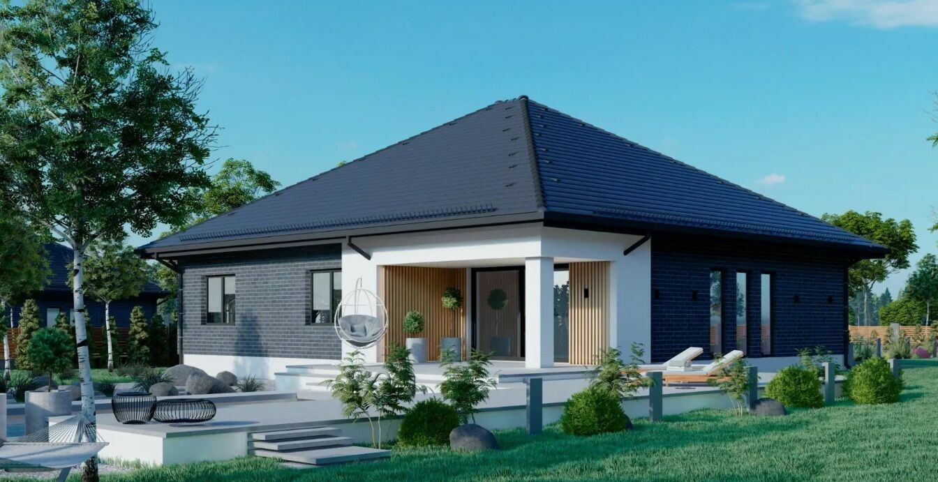 Dach czterospadowy pokryty wysokiej jakości blachodachówką Ruukki 40 – gwarancja trwałości, odporności na warunki atmosferyczne oraz estetycznego wyglądu.