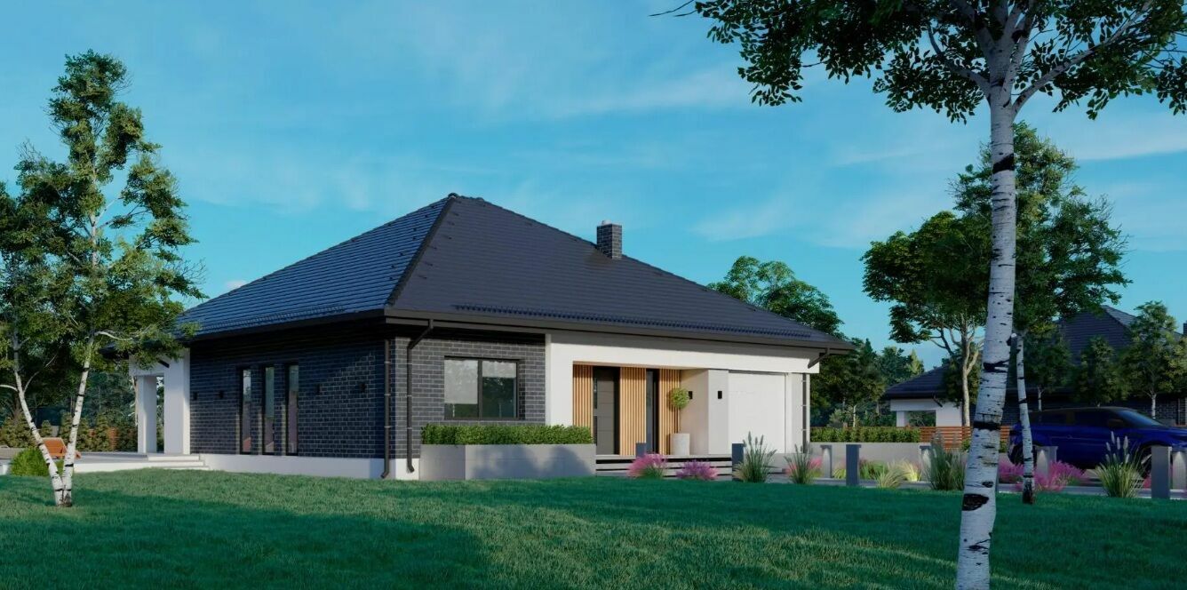 Nowoczesna bryła i funkcjonalny układ pomieszczeń.